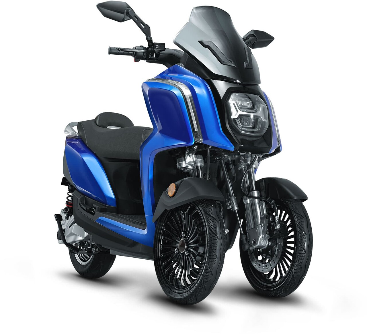 The scooter has two removable 80 Ah lithium batteries for a driving range of 200 km.