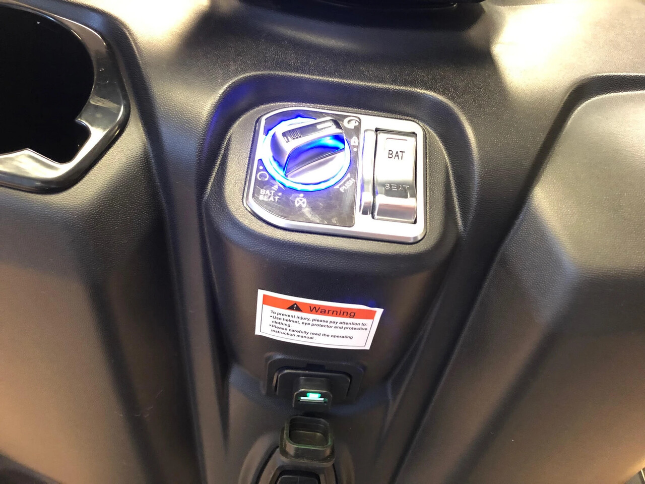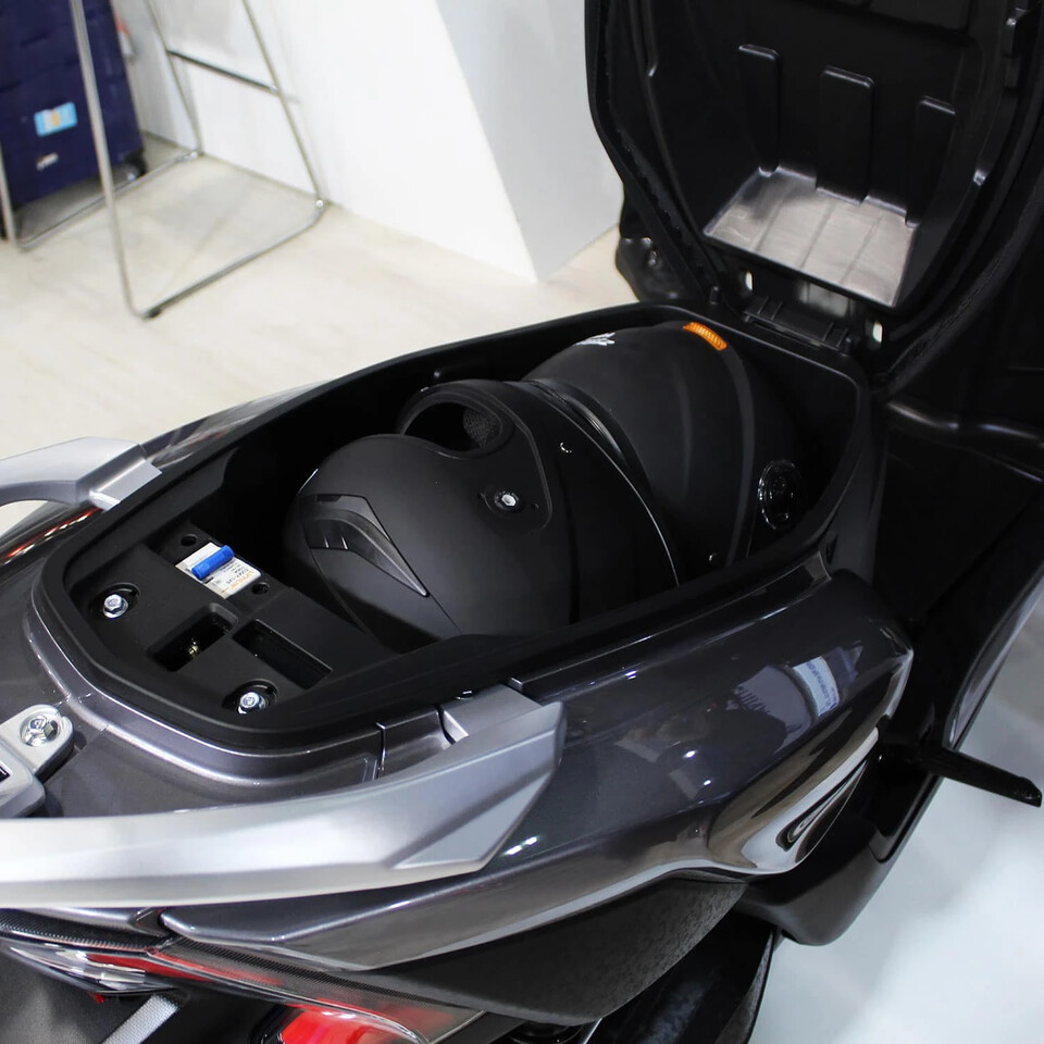 The scooter has a large 36 liter storage compartment under the seat that fits a helmet.
