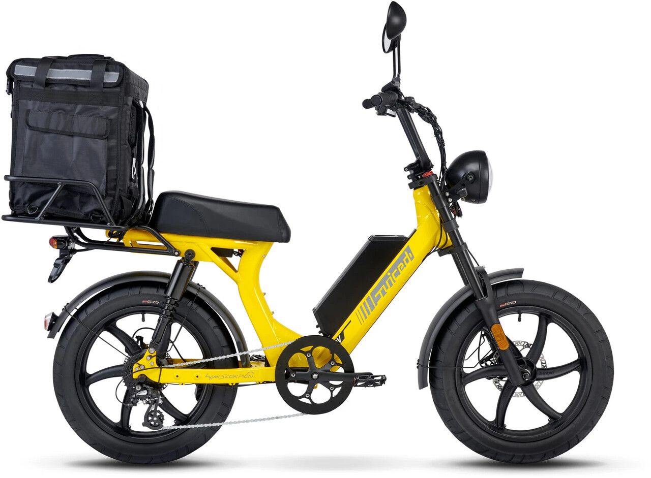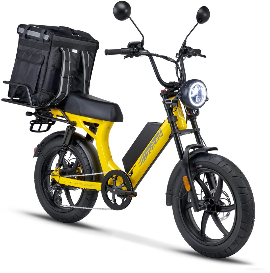 The Juiced Bikes HyperScorpion Express is a high quality Electric Cargo Moped by electric bike manufacturer Juiced Bikes from California, USA. The company was founded in 2009 by five-time American Champion and 2004 Olympian high jumper Tora Harris who graduated from Princeton University with a degree in Mechanical and Aerospace Engineering.