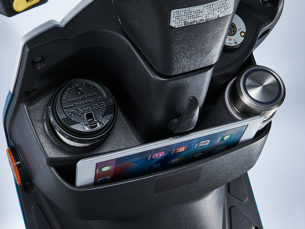 The scooter has a removable 26 Ah Lithium battery for a effective driving range of 60 km. The charge time of the battery is 300 minutes.